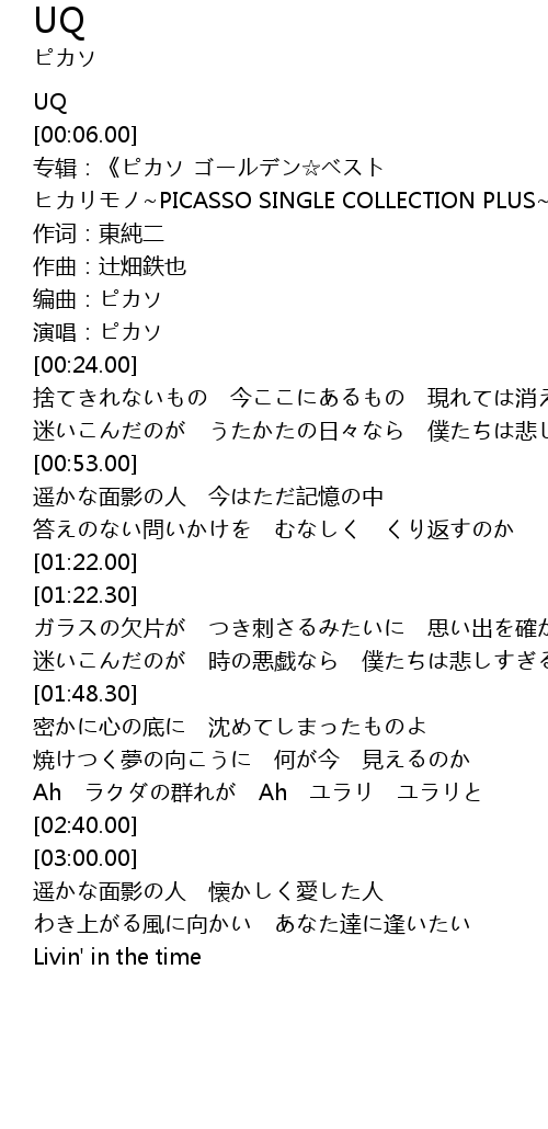 | [00:09.00] | 专辑:《ピカソ ゴールデン☆ベスト ヒカリモノ~PICASSO SINGLE COLLECTION PLUS~》 |