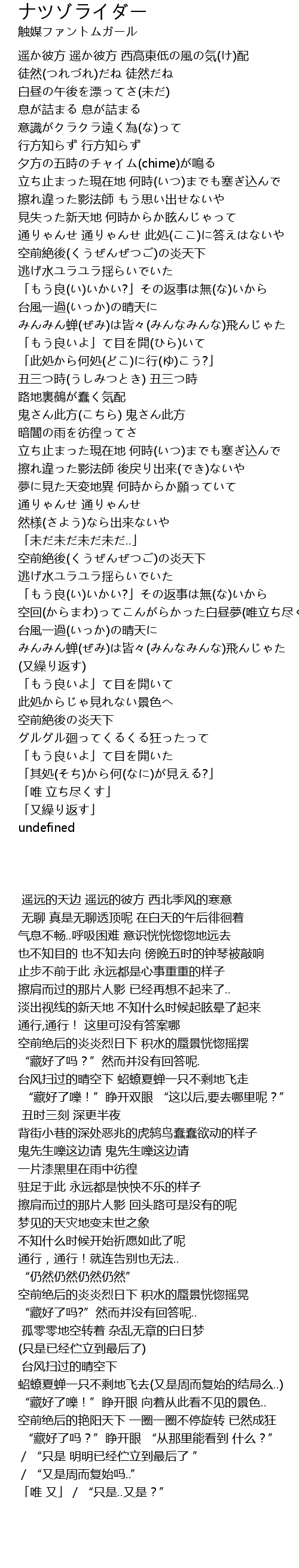 | [02:41.800] | 台风扫过的晴空下 蛁蟟夏蝉一只不剩地飞去(又是周而复始的结局么..) |