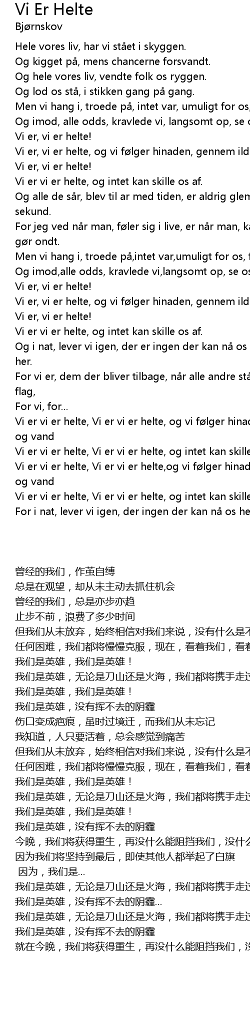 | [3:01:50] | Vi er vi er helte, Vi er vi er helte,og vi følger hinaden, gennem ild og vand |