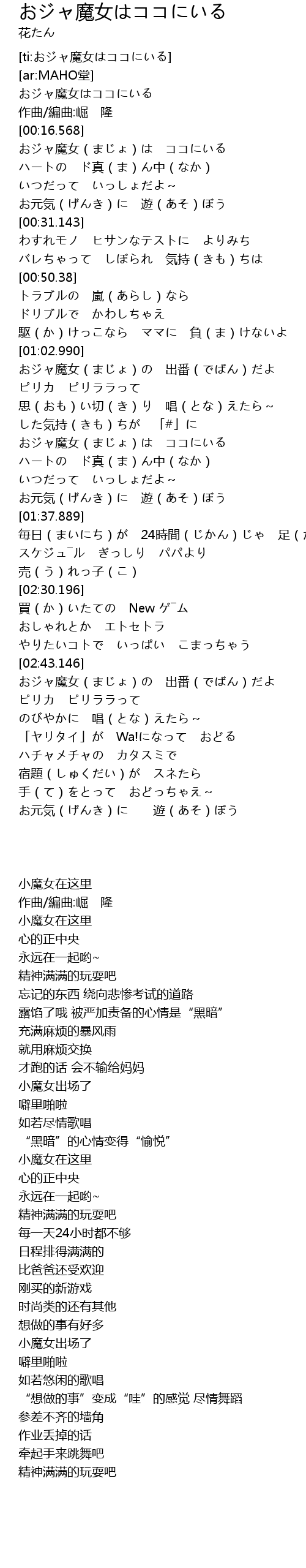 | [00:17.76] | おジャ魔女(まじょ)は ココにいる |
