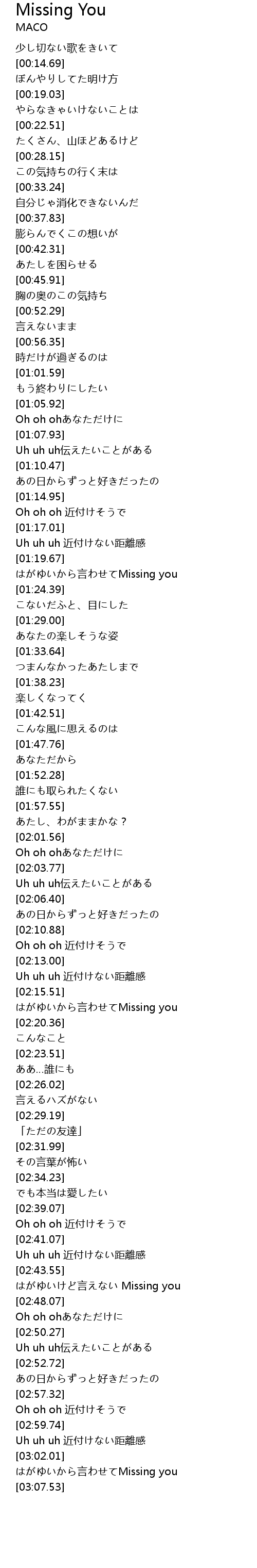 | [03:02.51] | はがゆいから言わせてMissing you |