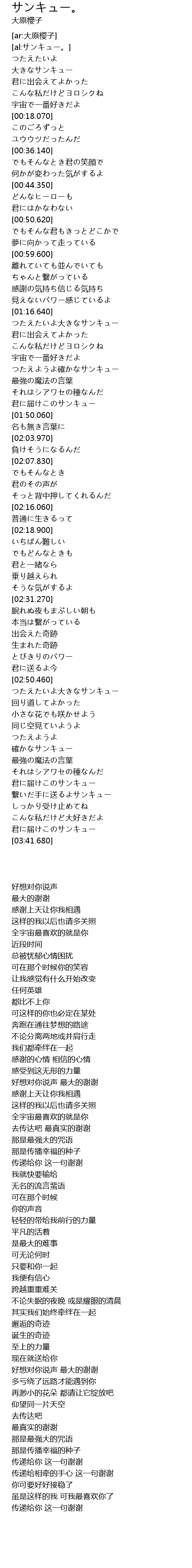 | [01:17.840] | つたえたいよ大きなサンキュー |