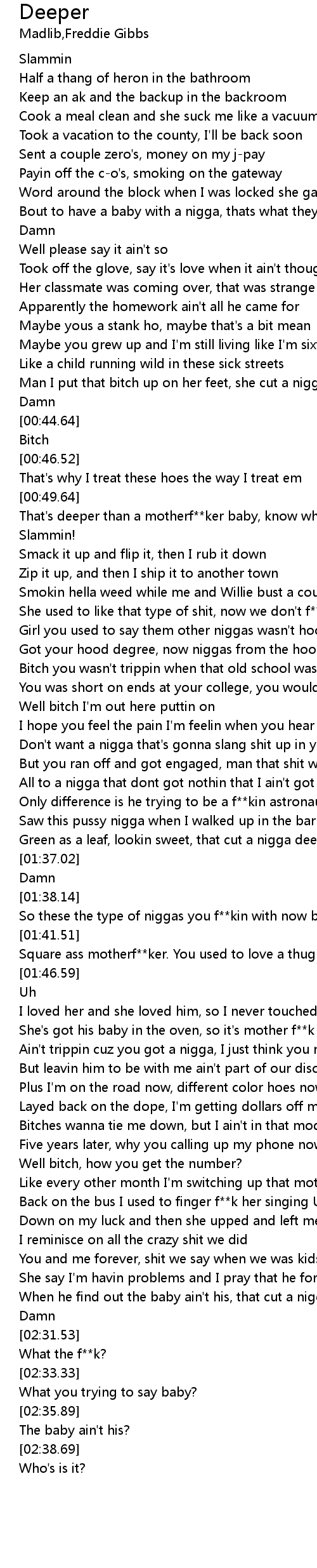 | [00:51.52] | That's deeper than a motherf**ker baby, know what I'm sayin |