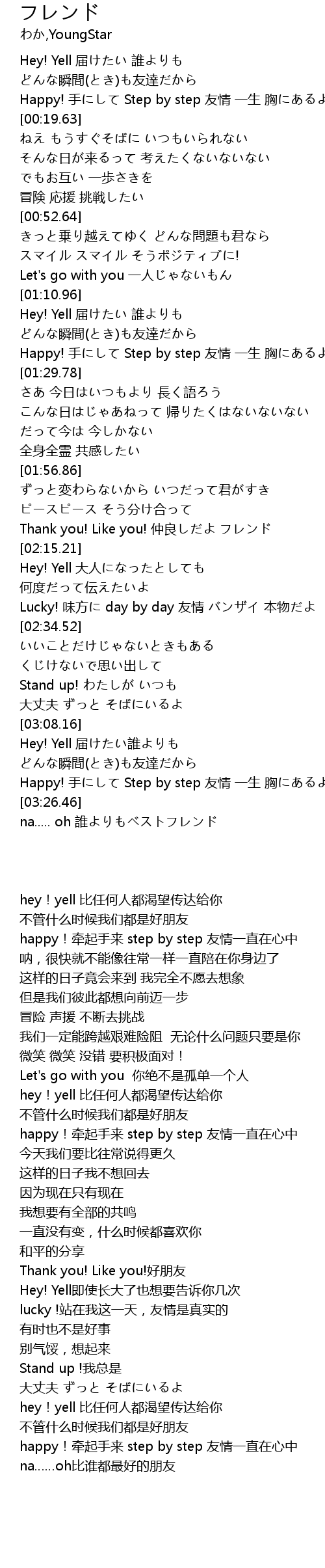 | [02:09.09] | Thank you! Like you! 仲良しだよ フレンド |