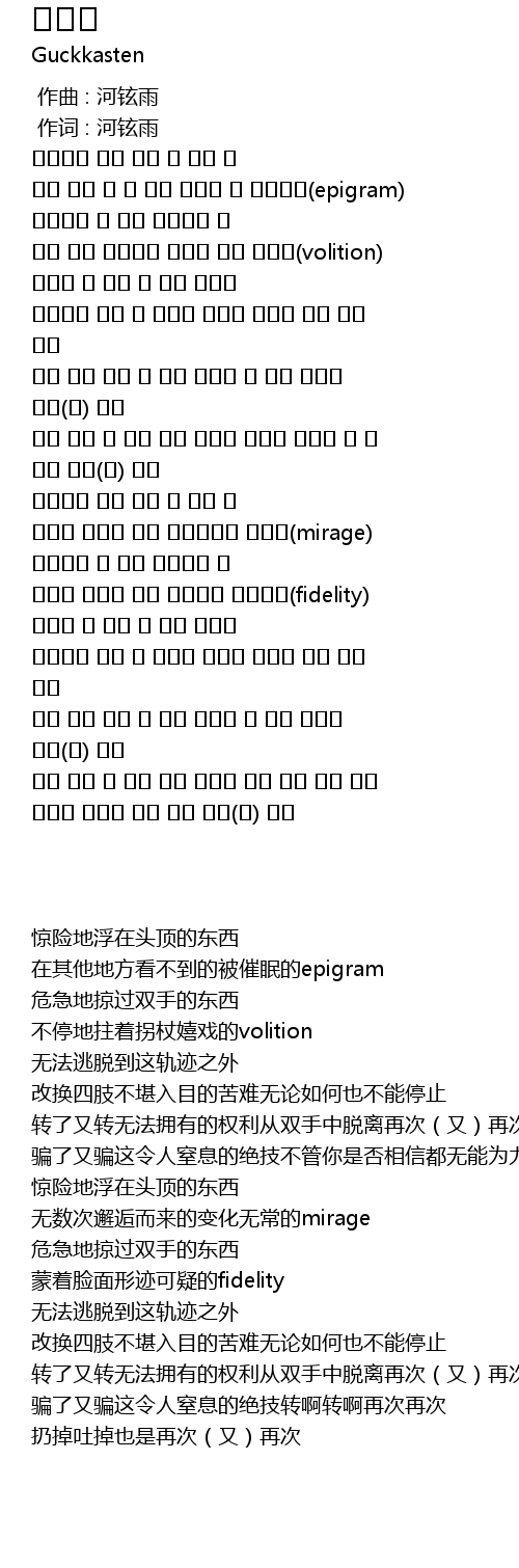 | [02:33.77] | 돌고 돌아 가질 수 없는 권리는 두 손을 벗어나 다시(또) 다시 |