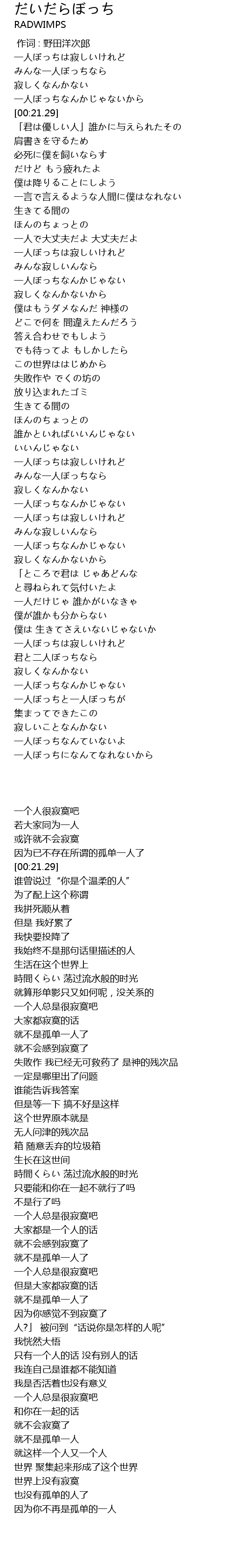 | [00:01.29] | 一人ぼっちは寂しいけれど |