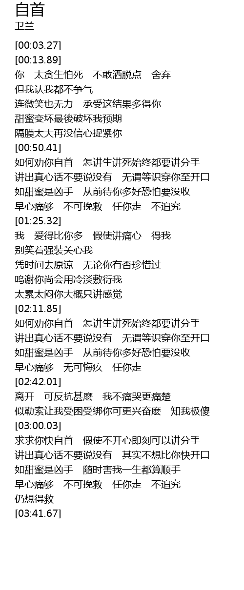 | [03:00.56] | 求求你快自首 假使不开心即刻可以讲分手 |
