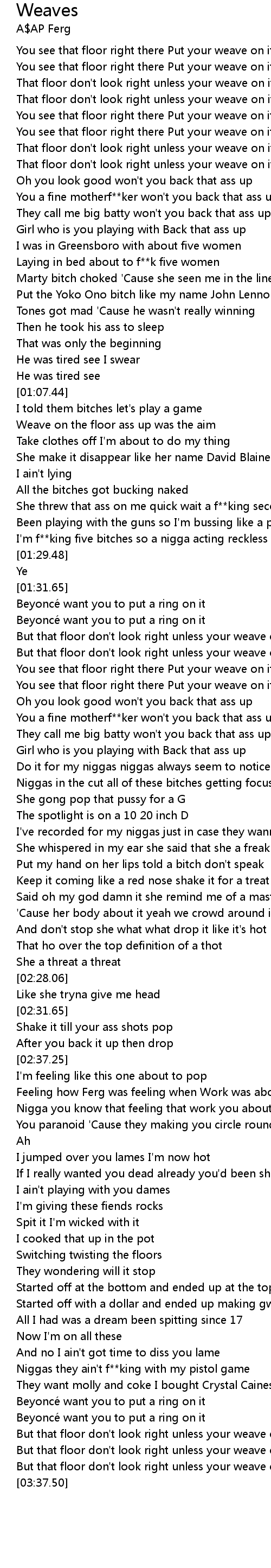 | [00:29.23] | You see that floor right there Put your weave on it |