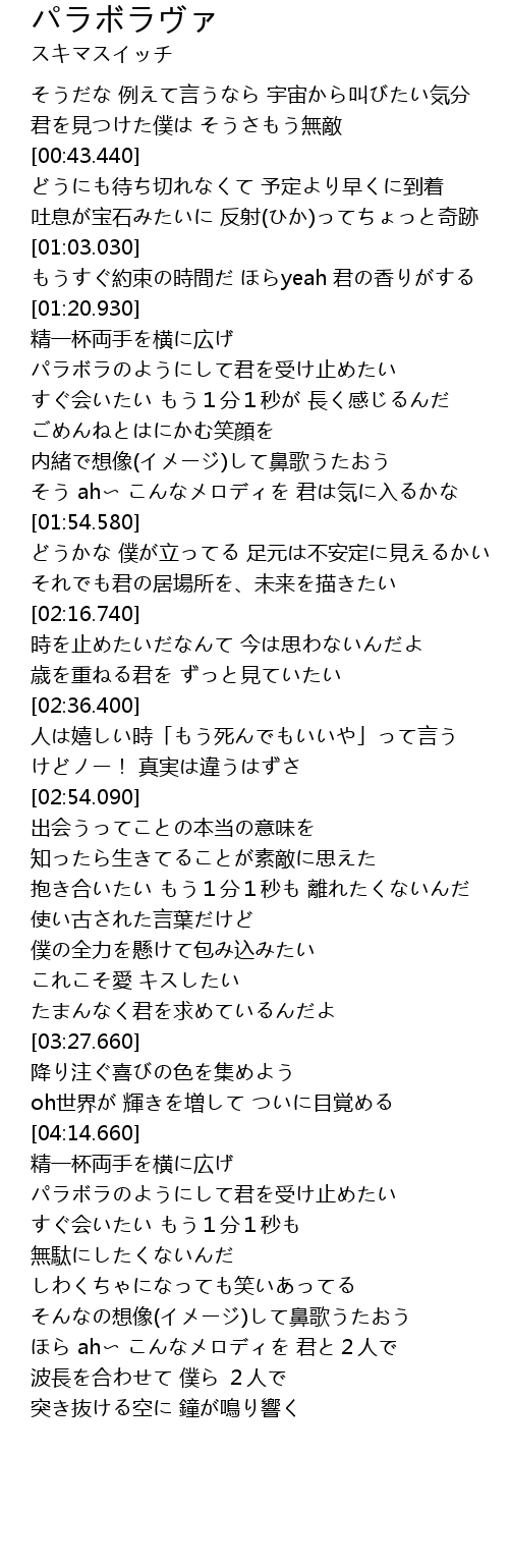| [01:21.430] | 精一杯両手を横に広げ パラボラのようにして君を受け止めたい |