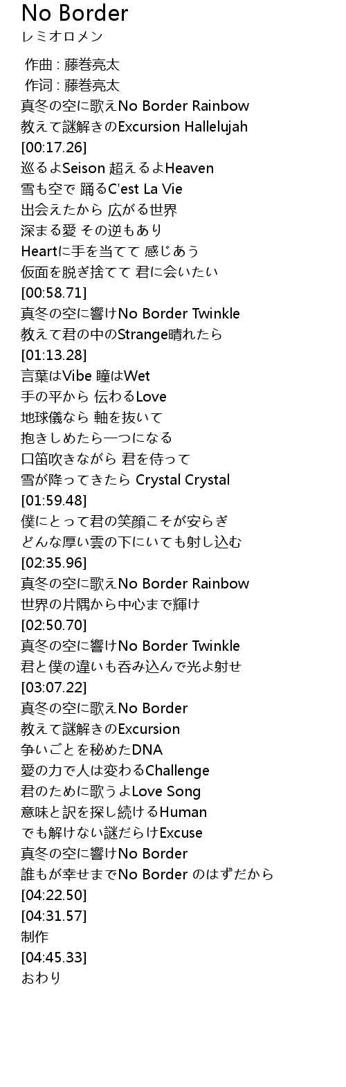 | [03:16.28] | 真冬の空に歌えNo Border |