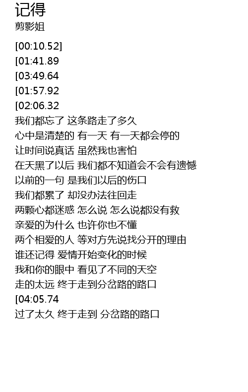 | [03:57.05] | 过了太久 终于走到 分岔路的路口 |