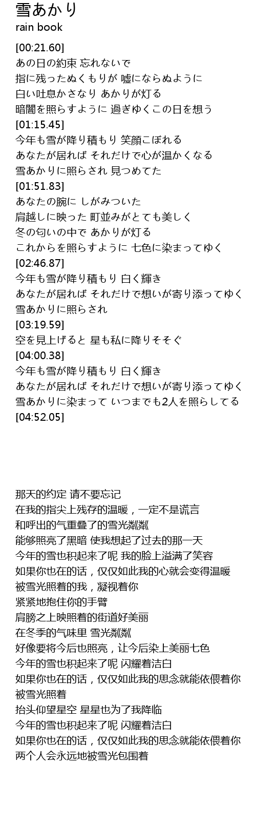 | [04:32.67] | 雪あかりに染まって いつまでも2人を照らしてる |