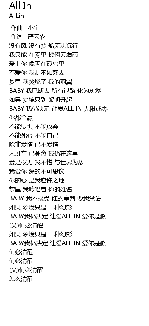 | [04:22.940] | BABY我仍决定 让爱ALL IN 爱你是瘾 |