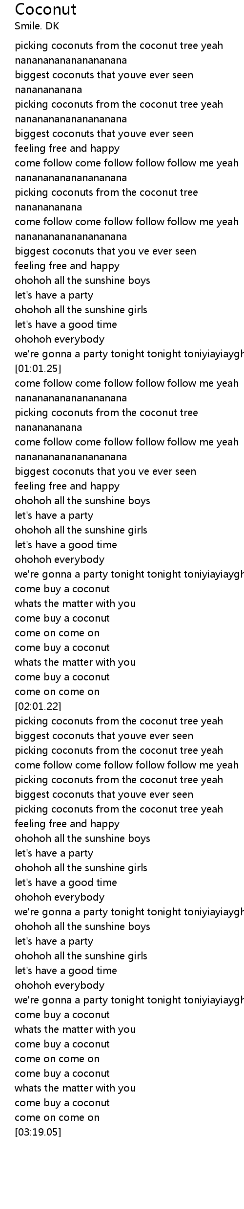 | [00:09.96] | picking coconuts from the coconut tree yeah |