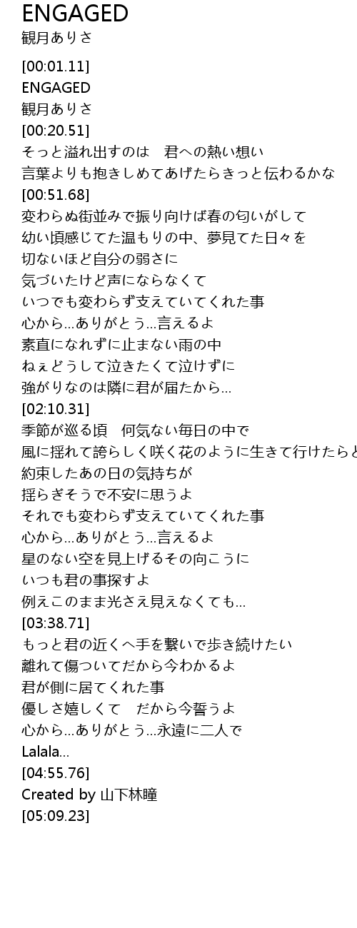 | [01:37.45] | 心から...ありがとう...言えるよ |
