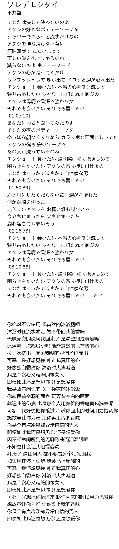 | [00:31.44] | 減らないのよ ボディーソープ アタシの心が減ってくだけ |