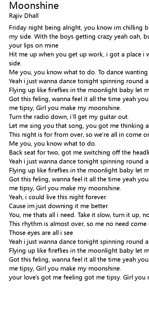Got this feling, wanna feel it all the time yeah your love's got me feeling got me tipsy, Girl you make my moonshine. |