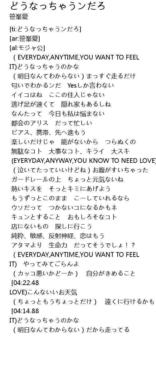 | [00:16.52] | (EVERYDAY,ANYTIME,YOU WANT TO FEEL IT)どうなっちゃうのかな |