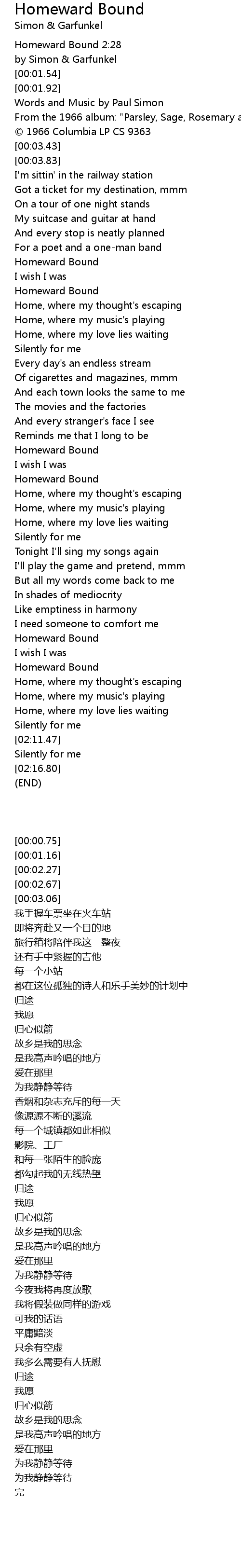 | [00:00.75] | Homeward Bound 2:28 |