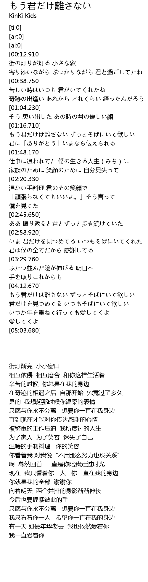 | [04:14.390] | もう君だけは離さない ずっとそばにいて欲しい |