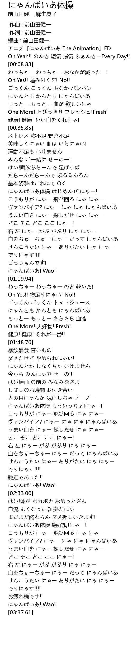 | [00:54.37] | にゃんぱいあ体操 はじめんぜ!にゃー! |