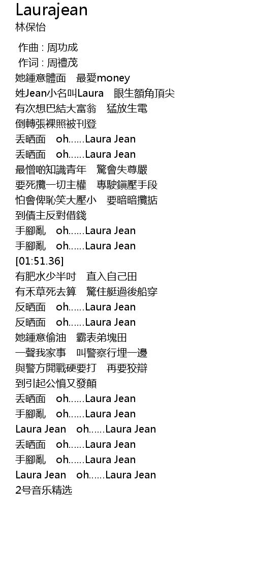 | [02:59.48] | diū shài miàn oh Laura Jean |