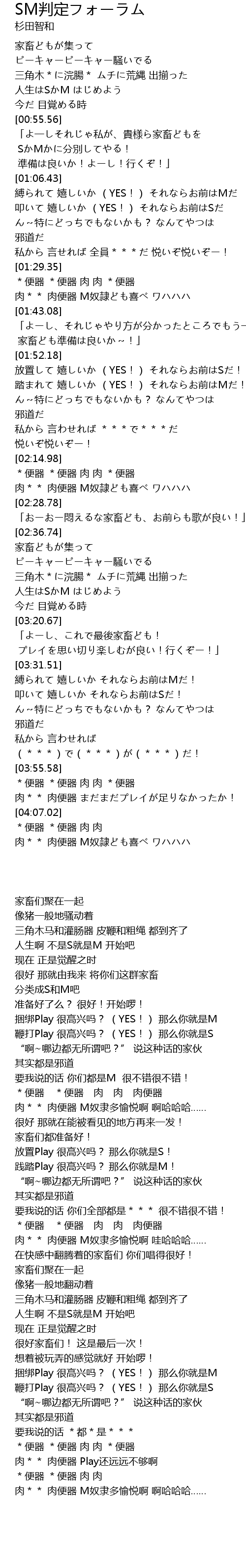 | [01:23.79] | 私から 言せれば 全員***だ 悦いぞ悦いぞー! |