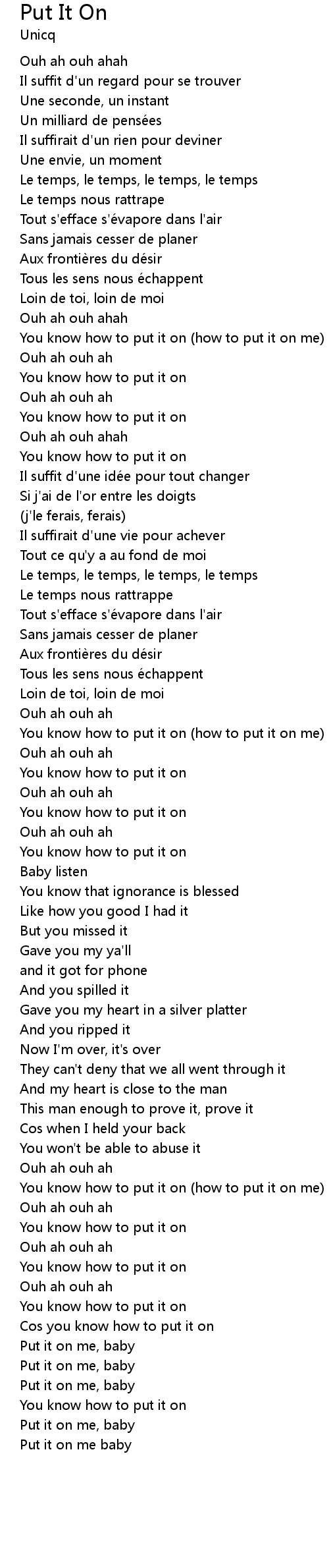 | You know how to put it on how to put it on me | |