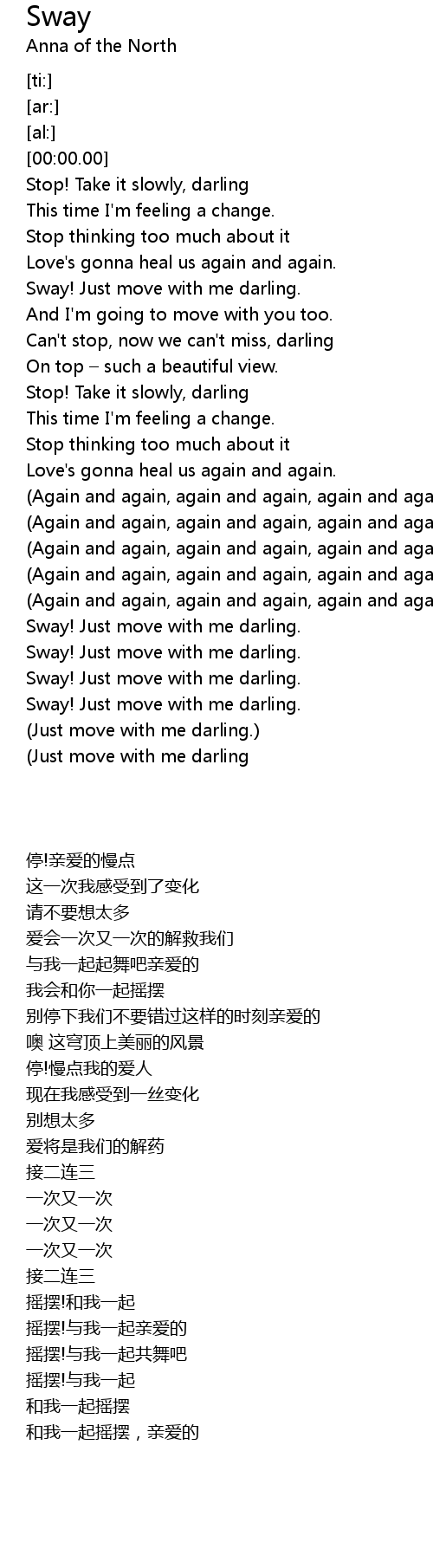| [02:00.76] | Sway! Just move with me darling. |