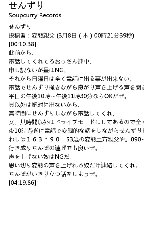 | [00:52.44] | わしは163*90 53歳の変態土方親父や。090-????-???? |