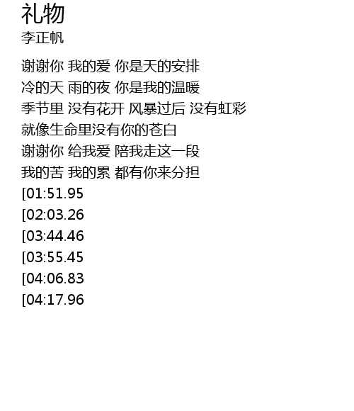 | [01:29.70] | 谢谢你 给我爱 陪我走这一段 |