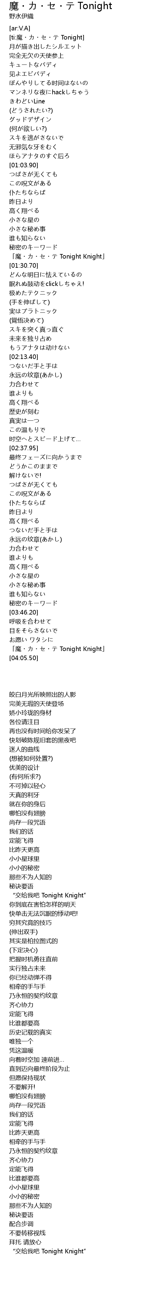 | [04:03.62] | 「魔・カ・セ・テ Tonight Knight」 |