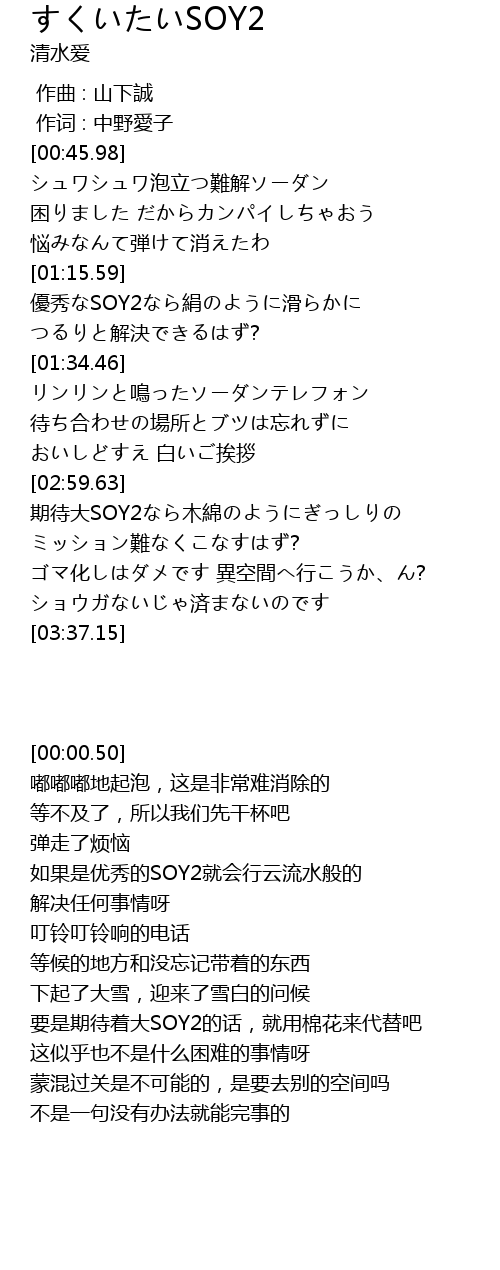 | [03:00.21] | 期待大SOY2なら木綿のようにぎっしりの |
