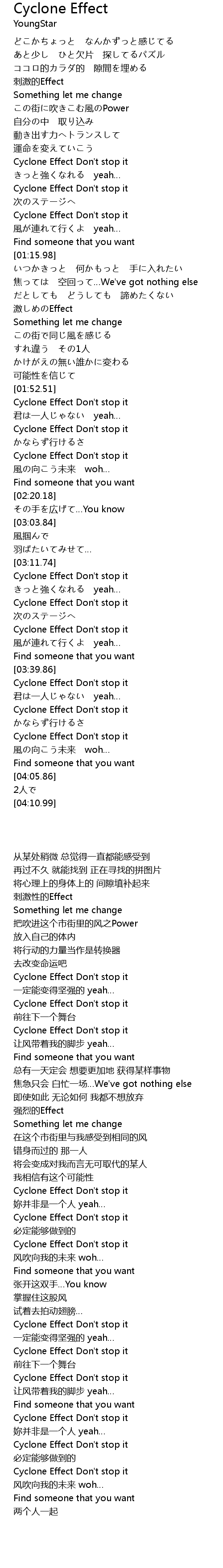 | [03:20.73] | Cyclone Effect Don' t stop it |