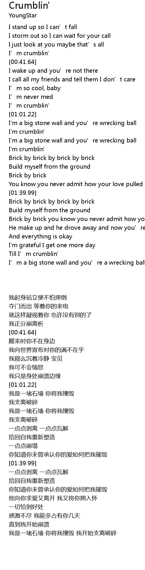 | [02:37.80] | 我是一堵石墙 你将我撞毁 我开始支离破碎 |