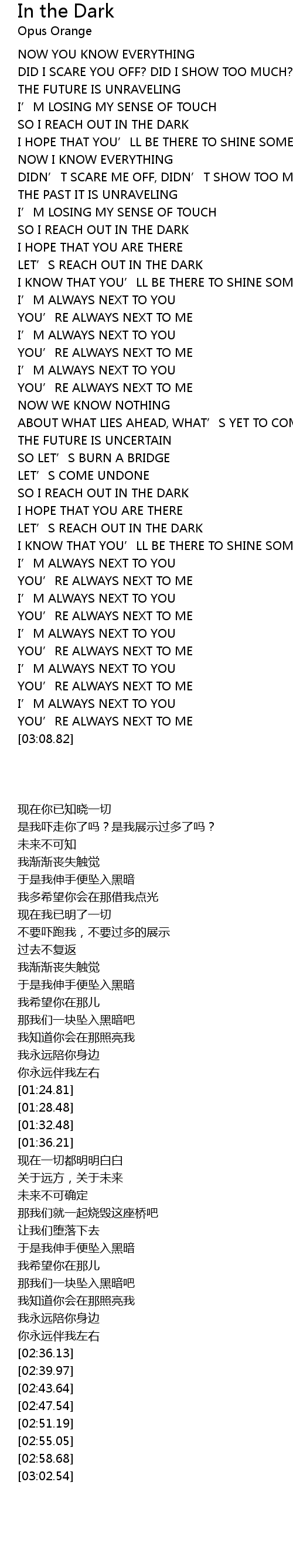 | [02:10.82] | SO I REACH OUT IN THE DARK |