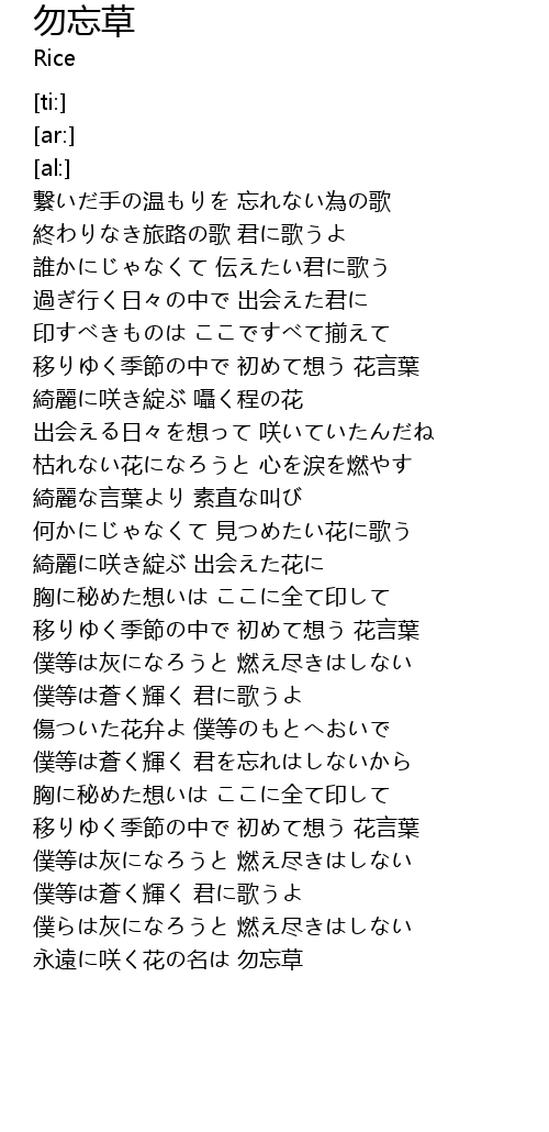 | [04:20.03] | 永遠に咲く花の名は 勿忘草 |