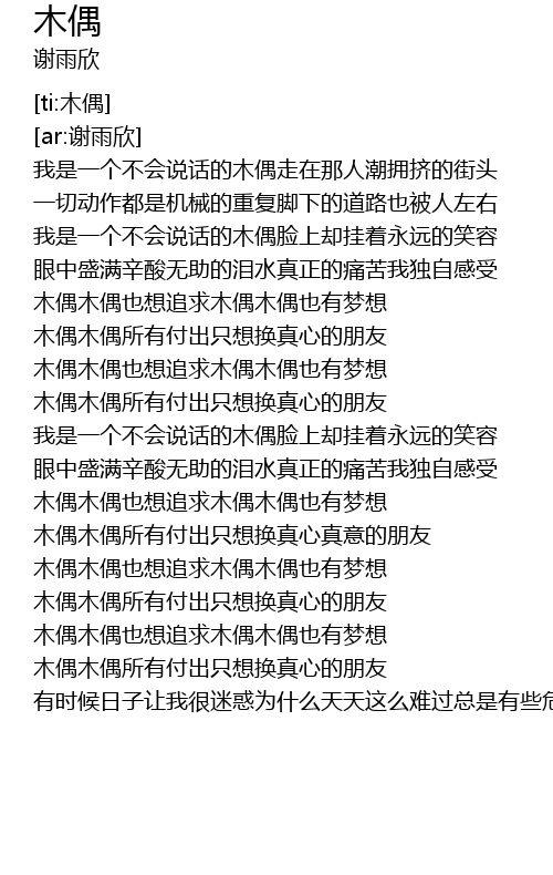 | [01:31.358] | 木偶木偶所有付出只想换真心的朋友 |