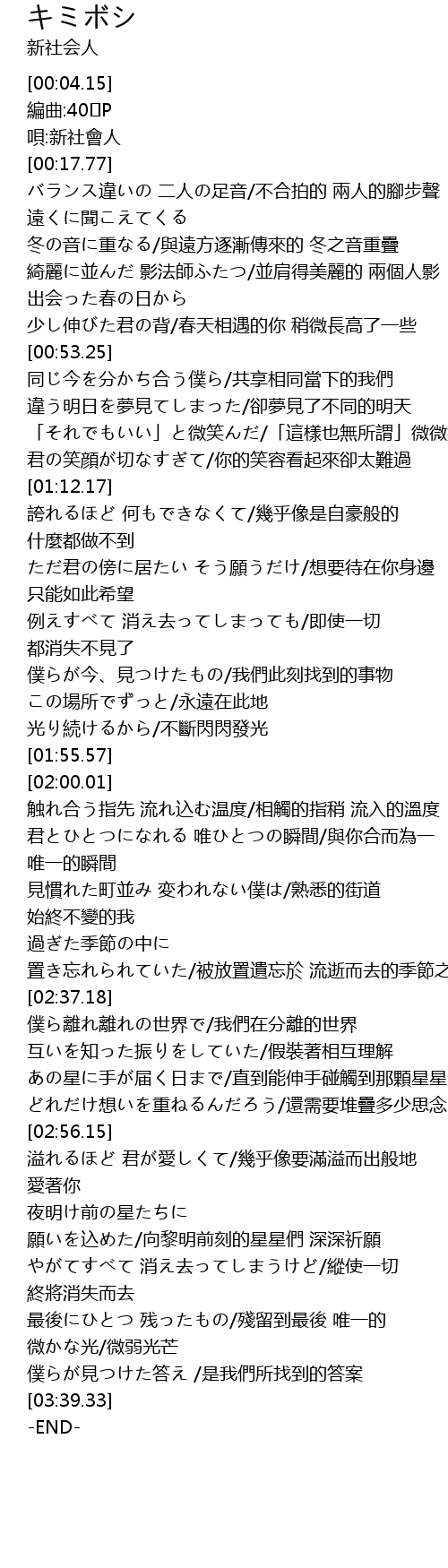 | [03:05.83] | 夜明け前の星たちに 願いを込めた/向黎明前刻的星星們 深深祈願 |