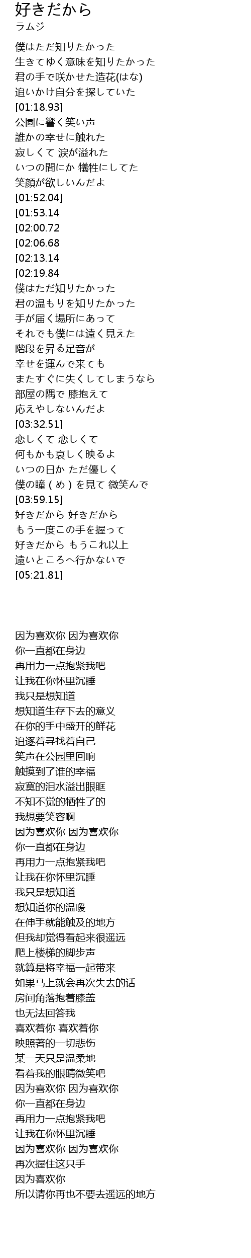 | [04:28.65][01:53.14][00:13.54] | 好きだから 好きだから |