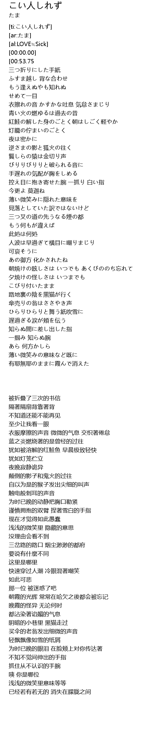 | [00:54.15] | 衣擦れの音 かすかな吐息 気怠さまじり |