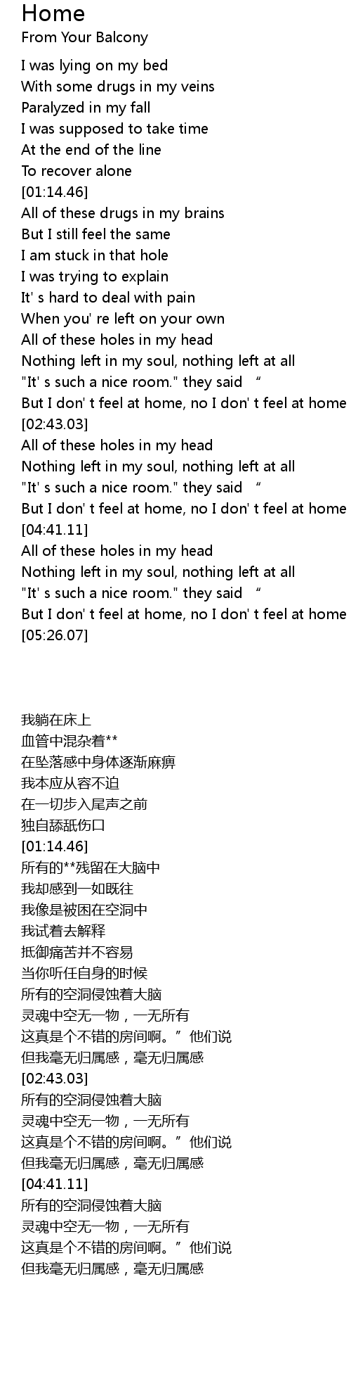 | [04:27.71] | But I don' t feel at home, no I don' t feel at home |