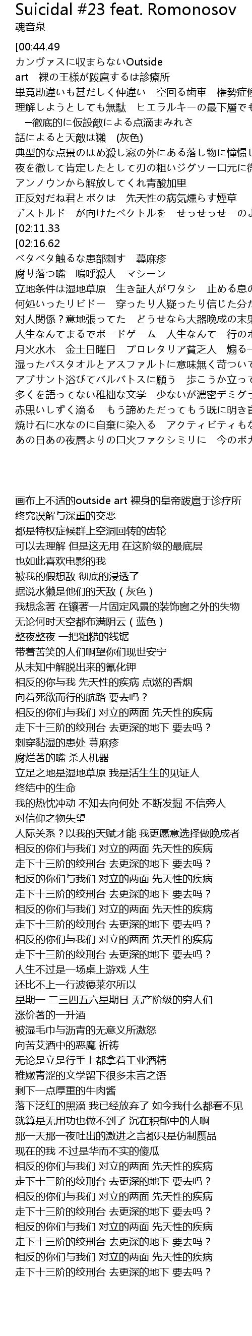 | [00:22.12] | 画布上不适的outside art 裸身的皇帝跋扈于诊疗所 |