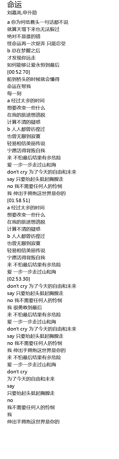 | [02:54.05] | don' t cry wèi le jīn tiān de zì yóu hé wèi lái |