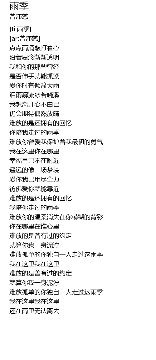 | [01:23.881] | nǐ péi wǒ zǒu guò de yǔ jì |