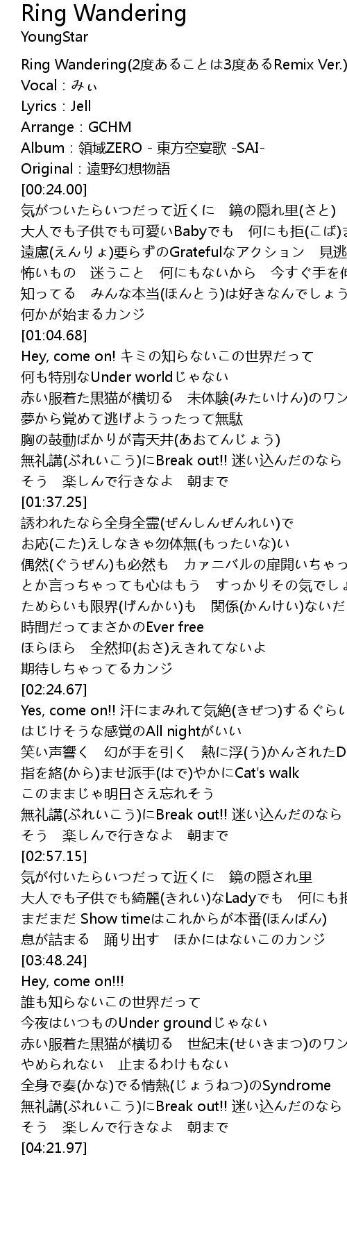 | [00:00.00] | Ring Wandering(2度あることは3度あるRemix Ver.) |