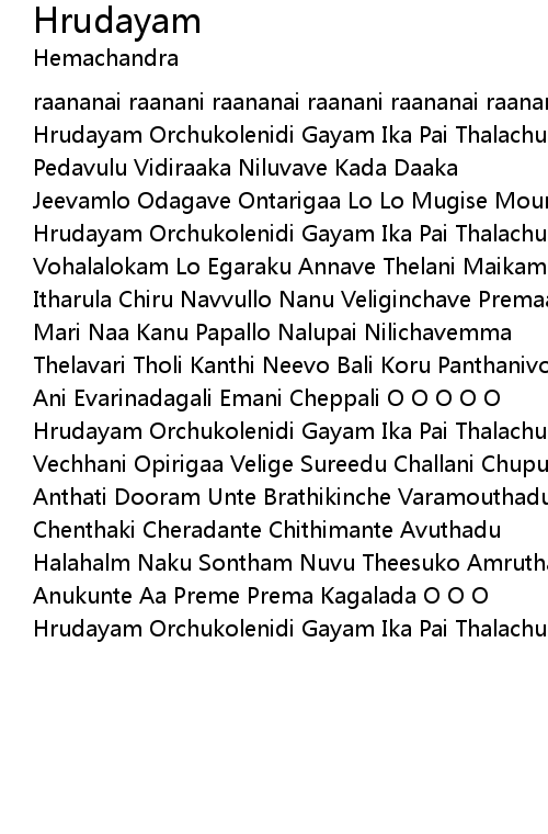 | Hrudayam Orchukolenidi Gayam Ika Pai Thalachukoranidi Ee Nijam |