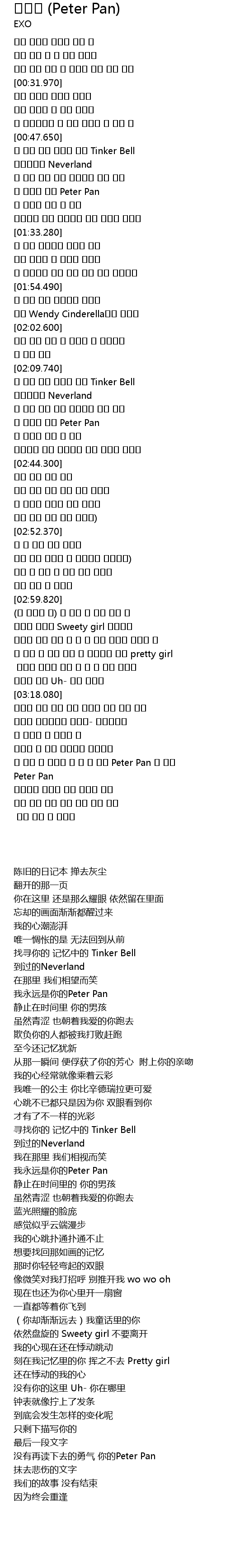 | [03:33.830] | 더 읽어 낼 용기가 안 나 난 너의 Peter Pan 난 너의 Peter Pan |