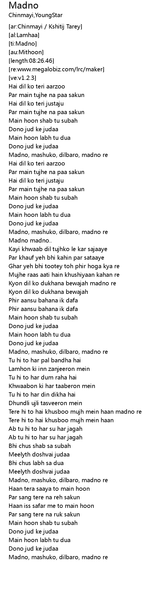 | [05:51.51] | Tere hi to hai khusboo mujh mein haan madno re |