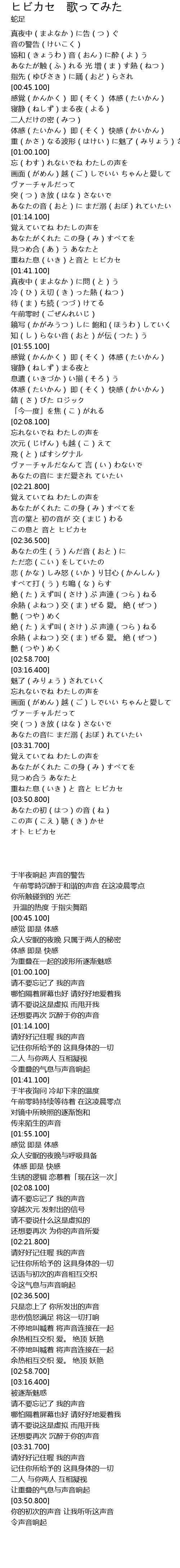 | [02:53.600] | 余熱(よねつ)交(ま)ぜる 愛。 絶(ぜつ) 艷(つや)めく |